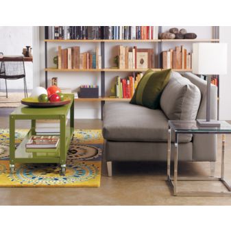 It's from CB2. It shows the gray, modern sofa that I want to fill with throw pillows in funky patterns. The great industrial green coffee table (totally kid friendly) and the shelves of storage/books in the background. Even the fun rug is where I'm going, but I'm thinking no pattern. I don't like the steel/glass side table -- as I'm not a fan of glass on tables (hello! kids!).